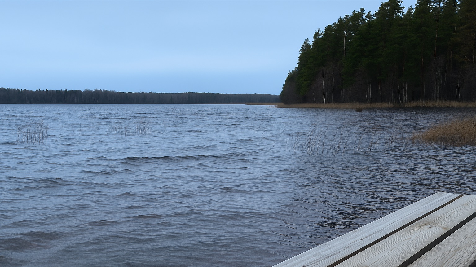 Волны на озере энергично бьются о берег. В кадре - лес, трава у кромки воды и динамичное движение волн, сопровождаемое характерным шумом прибоя и завыванием ветра. Видео отлично передаёт атмосферу настоящей природы: немного суровой, сырой и очень живой. Можно использовать как: - атмосферный фон - звуки природы для отдыха или концентрации - сопровождение к работе или чтению