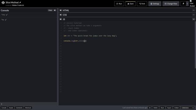 super quick tutorial on how to use the string method slice(). here is a link to the codepen https://codepen.io/walkerfrederick/pen/yRaQBJ github: https://github.com/WalkerFrederick twitter: https://twitter.com/WFrederickTweet