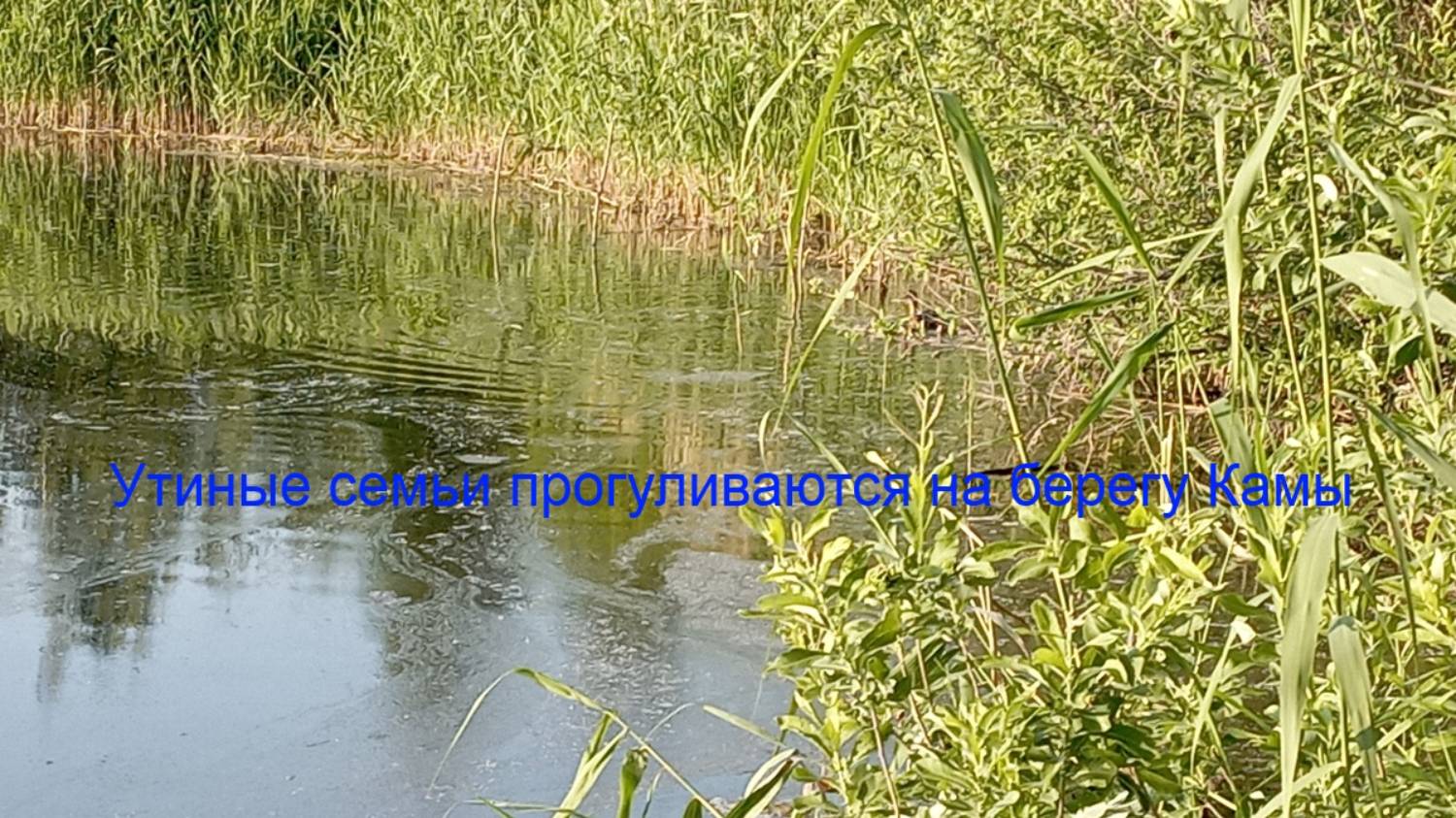 Утки и утята плавают вдоль берега Камы. Природа в заливе