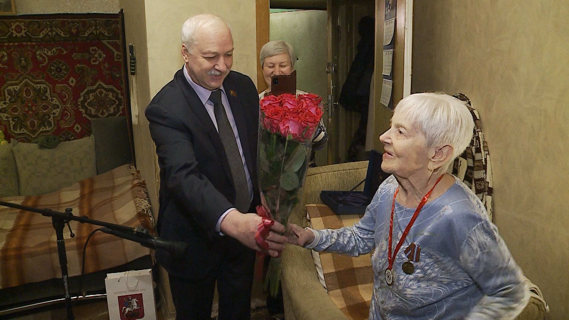 Первый секретарь МГК КПРФ, лидер фракции КПРФ в Мосгордуме Николай Зубрилин поздравил с юбилеем ветерана Министерства среднего машиностроения Дину Кирсановскую
