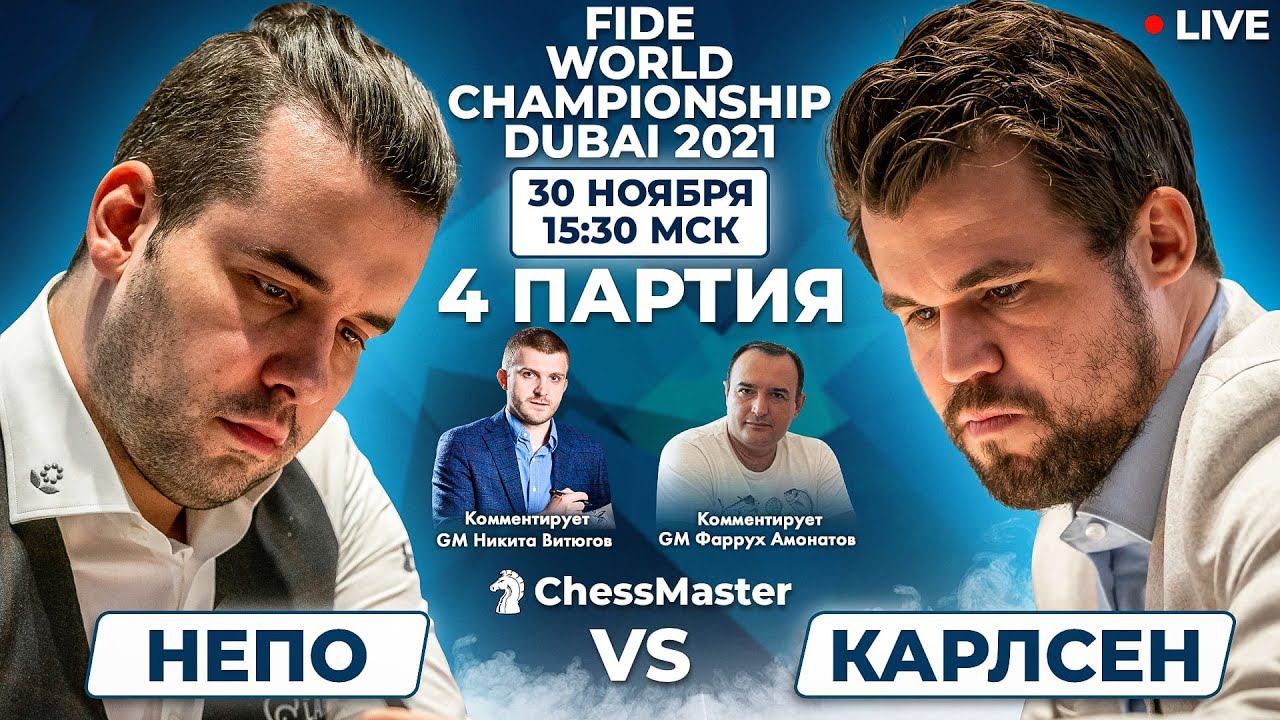 Транслируем главный шахматный праздник последних нескольких лет - матча за звание чемпиона мира Карлсен - Непомнящий. Четвертый день комментируем с действующим чемпионом России - Никитой Витюговым! А также с нами один из лучших мировых тренеров Фаррух Амонатов и мастер FIDE Максим Омариев. https://school.chessmaestro.ru/sales - Черная пятница в ChessMaster Донат - https://www.donationalerts.com/r/chessmaster Матч проходит в Дубае с 26 ноября по 16 декабря. Оперативные новости с матча в наших соц. сетях: Instagram https://www.instagram.com/chessmaestro/ Телеграмм https://t.me/ChessMaestro Начало трансляций в 15:30 МСК Игровые дни: 26-28, 30 ноября, 1, 3-5, 7-8, 10-12, 14 декабря. Тай-брейк: 15 декабря. Выходные дни: 29 ноября, 2, 6, 9, 13 декабря. Призовой фонд - 2 миллиона евро, победитель получает 60 %, если победа будет достигнута на тай-брейке – 55% Подписаться на канал https://goo.gl/nY2kmn ♕ - http://chessmaestro.ru/21mistakeyoutube/ книга 21 критическая ошибка в шахматах - получите Бесплатно ChessMaster в соц. сетях: VK https://vk.com/chessmaestro Facebook https://www.facebook.com/ChessMasterClub Instagram Максима Омариева - https://www.instagram.com/maxomariev #карлсеннепомнящий #CarlsenNepo #ChessMaster #шахматы