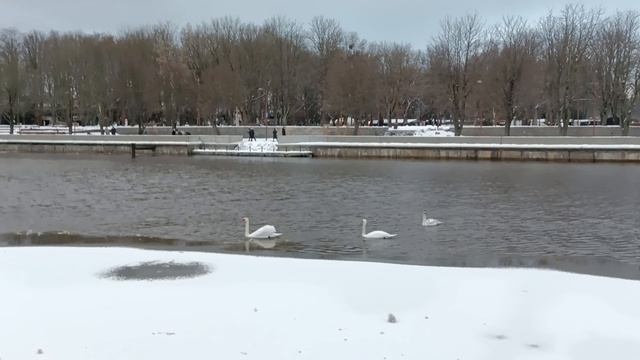 лебеди в реке приголя в центре Калининграда