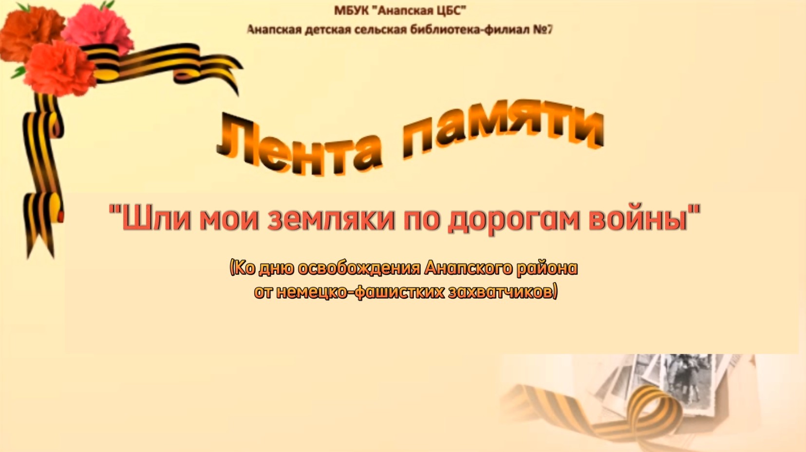 Памятью жив человек! Лента памяти «Шли мои земляки по дорогам войны» посвящается анапчанам участникам Великой Отечественной войны 1941-1945 годов. В видео материале рассказывается о Кошевом Т.А., Резникове Я.Н., Кухоль П.Д., Виноградовой К.М., Боброве И.А., об их боевом пути, подвигах и наградах. С замиранием сердца они вспоминали те самые страшные годы, которые вошли в историю нашего народа, как Великая Отечественная Война. Благодарность живым победителям! И вечная память павшим за свободу нынешнего поколения. Подготовлено библиотекарем Анапской детской библиотеки-филиала №7 Л.К. Рыбаковой