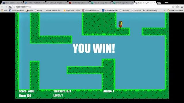 The game's official name is now Super Booty Diver We now have the game running 2 levels as you'll see Diver is now able to take one hit by ink blasts ,and starfish before dying although octos are still insta-kills Very simple Level End ,and Game Over screens Very early/simple HUD showing Score, Time, Level, Treasures Left ,and Ammo left. We are having an issue getting the score to carry over from each level. Remember this is still very early ,and being built on Construct2. Target release is PC, Wii U, and possibly Android devices.