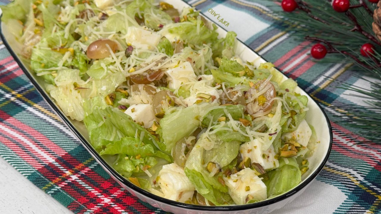 Ингредиенты: Листья салата Айсберг: 200г Виноград: 200г Фисташки неочищенные: 100г Брынза: 150 – 200г Любимый твердый сыр или пармезан: 80г Масло растительное: 3-4 ст.л Мёд: 2 ч.л Соль: щепотка Перец черный: щепотка