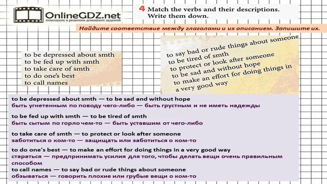 Другие решения смотри тут: https://urokitv.net/49-angliyskiy-yazyk-7-klass-biboletova-m-z Urokitv.net это школьные учебники и решебники с 1-го по 11-й класс школы. Ждем ваших предложений и пожеланий. Если вам нравится, то что мы делаем расскажите про нас своим друзьям и одноклассникам. В упражнении 4 из раздела Homework (Unit 3) необходимо подобрать к глаголам соответствующее описание. Справиться с этим упражнением будет легко, если сначала вы посмотрите видео с подробным объяснением. Unit 3 Homework Задание №4 - Английский язык "Enjoy English" 7 класс (Биболетова)