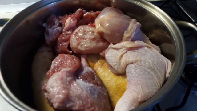 Ингредиенты: Курица Говядина Свинная рулька, ножка Лук Соль Перец Лаврушка