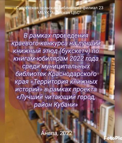 В рамках краевого конкурса книжных этюдов (букскетчей) «Территория книжных этюдов», в рамках проекта «Лучший читающий город, район Кубани». Организатор конкурса: государственное бюджетное учреждение культуры Краснодарского края «Краснодарская краевая универсальная научная библиотека им. А.С. Пушкина" Конкурс проводится в целях развития инновационной деятельности, повышения престижа книги и чтения среди жителей Краснодарского края. Видео подготовила заведующий Супсехской сельской библиотекой- филиалом 23 С.В. Ермолаева