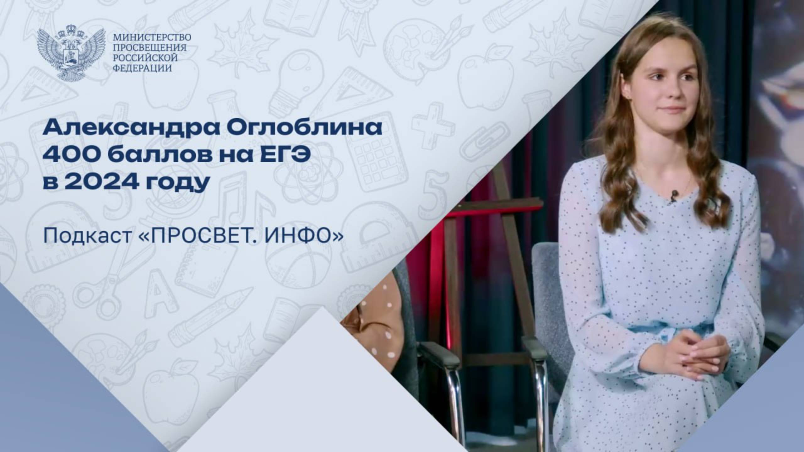 Александра Оглоблина – единственная в России выпускница 2024 года, сдавшая ЕГЭ на 400 баллов. После блестящего прохождения экзаменов девушка поступила в МГТУ имени Н.Э. Баумана. Вместе со своей мамой Александра стала героиней нового выпуска подкаста «ПРОСВЕТ. ИНФО». В чем секрет успешного выступления на ЕГЭ? Как семья поддерживает Александру? Какой талант девушки особенно ценит ее мама? Обо всем этом и многом другом Александра рассказала ведущему программы Алексею Ильину. Смотрите выпуск и узнавайте ответы на все вопросы! Подкаст «ПРОСВЕТ. ИНФО» – программа пресс-центра Минпросвещения России.