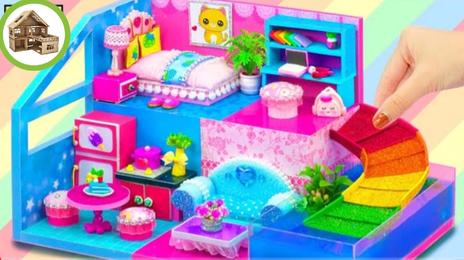 Миниатюрный двух этажный домик бассейн с цветной водной горкой для семьи из картона /197