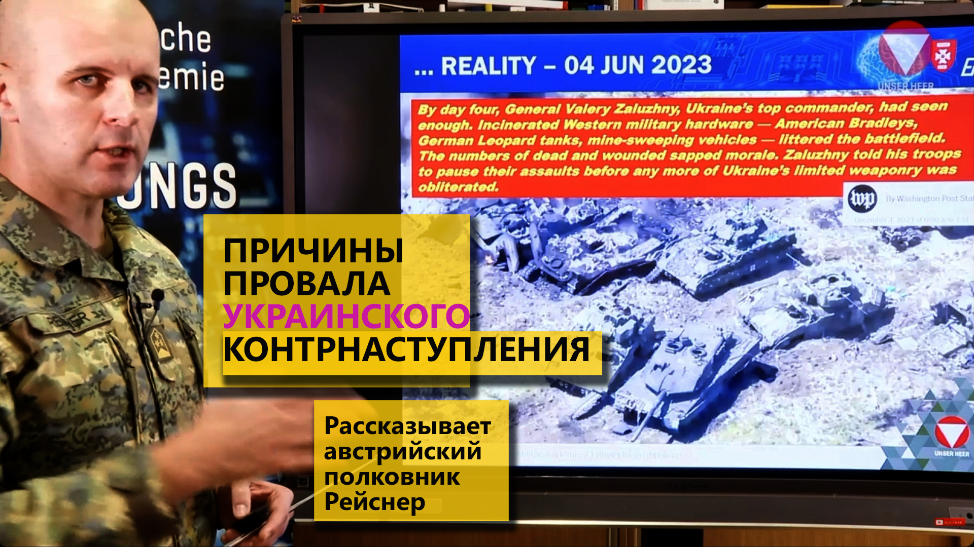 В сегодняшней передаче австрийский военный эксперт полковник Рейснер расскажет о причинах провала украинского контрнаступления. Он рассматривает эффект от зубов дракона на линии Суровикина, а также применение ВКС авиабомб ФАБ 500 по позициям украинских войск. В передаче можно увидеть кадры подбития и уничтожения образцов западной бронетехники - танков Леопард, бронетранспортеров Мардер и боевых машин Бредли. Также в кадре можно увидеть анализ применения российских беспилотников камикадзе Ланцет. Поддержать автора 4276 3801 7692 1844 Сбер Мой канал на Youtube https://www.youtube.com/channel/UCiuYg57RiTVHoTKtsqKoZ Почта для связи/рекламы/идей для роликов torn_keds_philosopher@mail.ru Планирую запустить новый формат - видеоподкаста с гостями Пишите, если вы готовы принять участие в видео-подкасте (беседе/интервью с вами) Источник видео https://www.youtube.com/@OsterreichsBundesheer