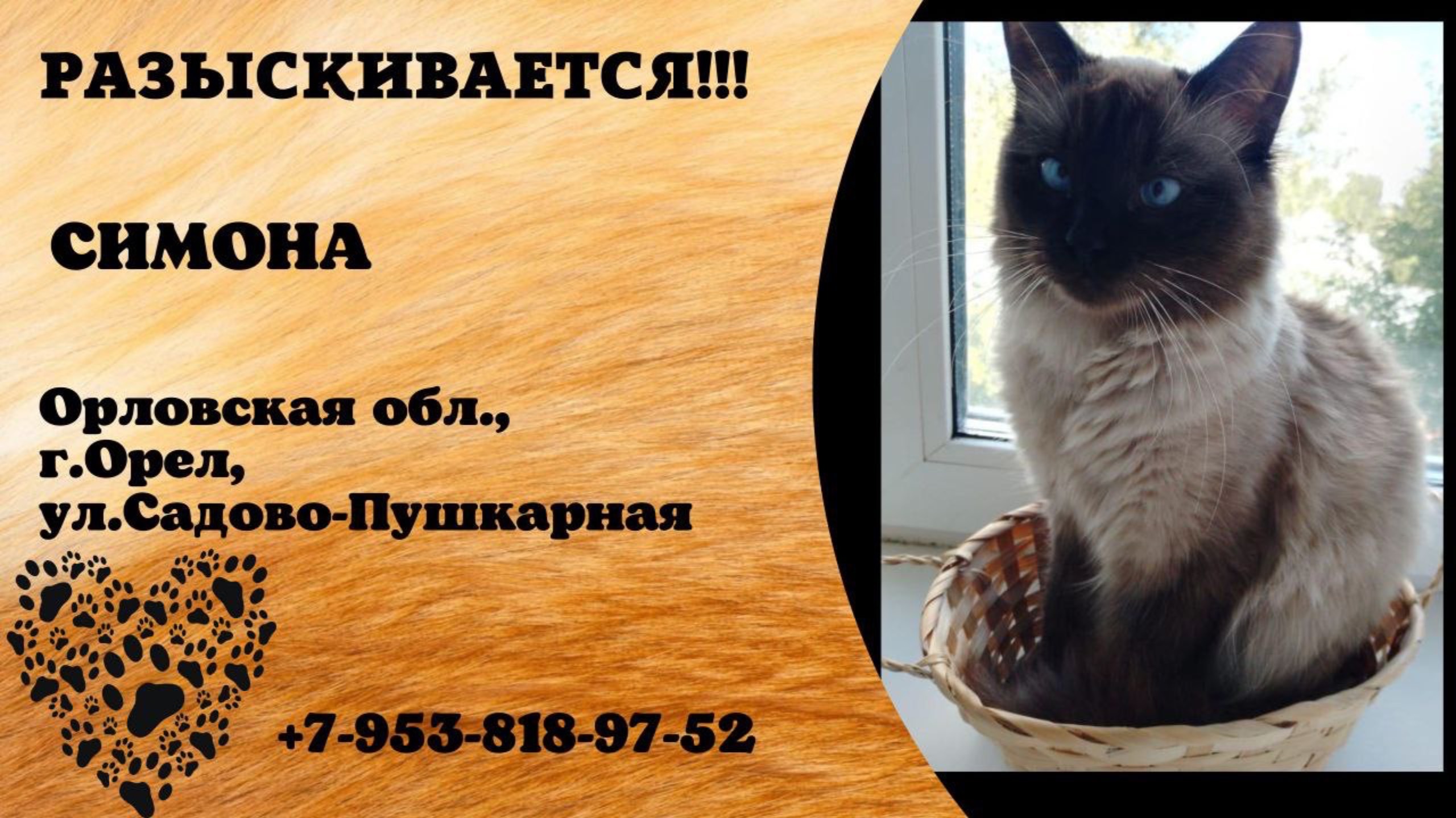 Пропала кошка! СИМОНА. Орловская обл., г.Орел.