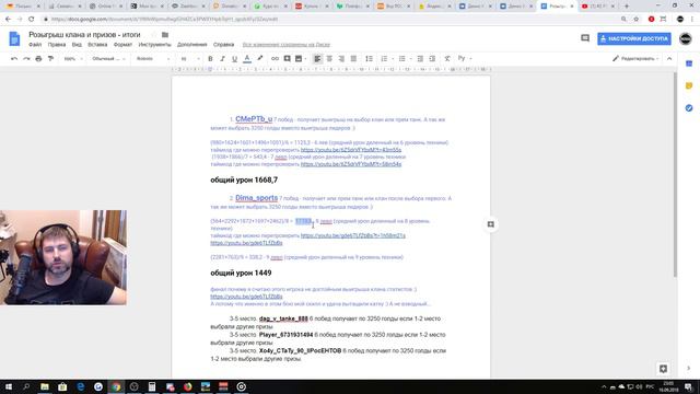 Привет. Все подробности выигрыша в файлике. https://docs.google.com/document/d/1fWkWlpmu8wglGH4ZCe3PWXYHpbTqH1_qpzbXFyJ3Zes/edit 1. CMePTb_u 7 побед - получает выигрыш на выбор клан или прем танк. А так же может выбрать 3250 голды вместо выигрыша лидеров :) 2. Dima_sports 7 побед - получает или прем танк или клан после выбора первого. А так же может выбрать 3250 голды вместо выигрыша лидеров :) 3-5 место. dag_v_tanke_888 6 побед получает по 3250 голды если 1-2 место выбрали другие призы. 3-5 место. Player_6731931494 6 побед получает по 3250 голды если 1-2 место выбрали другие призы. 3-5 место. Xo4y_CTaTy_90_IIPocEHTOB 6 побед получает по 3250 голды если 1-2 место выбрали другие призы. Донаты не самоцель и не решающий фактор для стримов. Обучение и показать как надо играть это реально основной решающий стимул!!! Но и не забывайте что САМАЯ ЛУЧШАЯ поддержка для меня как стримера, это ПОДПИСКА НА КАНАЛ и поставить колокольчик. Так как стримы внеплановые.