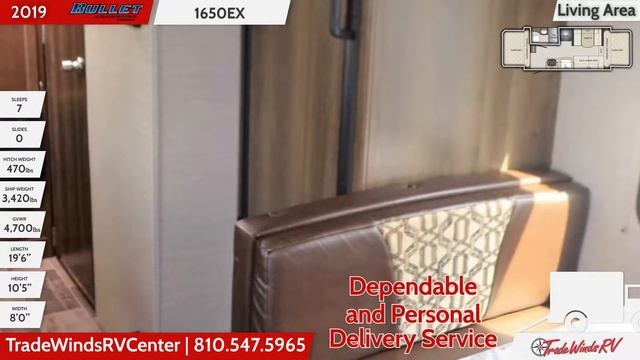 Shop 2019 Keystone Bullet Crossfire 1650EX and check out our huge online selection now at https://tradewindsrvcenter.com/bullet-crossfire-rv/bullet-crossfire-1650ex or call TradeWinds RV at 810-547-5965! Bullet Crossfire 1650EX Travel Trailer Check out this great 2019 Keystone Bullet Crossfire 1650EX. This Travel Trailer has slides and sleeps 7 people. It has a 43 gallon fresh water tank, a 30 gallon gray water tank, and a 30 gallon black water tank. The dimensions of this Travel Trailer are 10' 5" ft. 5 inches tall by 8 ft. 0 inches wide. Its hitch weight is 470 lbs., ship weight is 3420 lbs., and the GVWR is 4700 lbs. Check out this great RV today! Flint's Full-Service RV Dealership Has All the Great Bullet Crossfire RVs! As Flint's full-service RV dealership, TradeWinds has an impressive inventory and equally impressive deals! We carry all the top name brands our customers know and love, like this 2019 Bullet Crossfire 1650EX. If you want to choose features to make your RV unique, such as interior colors or exterior graphics, use our Custom Build tool to customize it and we'll order it. Our financing department works hard to get the lowest financing rates for our customers to make the buying experience easy and affordable. For our customers who are not local, we offer a trusted and insured delivery service. Our nationwide and international delivery transports your RV from our store to your door with GPS tracking the whole way. Getting the perfect RV couldn't be any easier! Come see us or visit us online to learn more about this 2019 Keystone Bullet Crossfire Travel Trailer. You'll be glad you did!