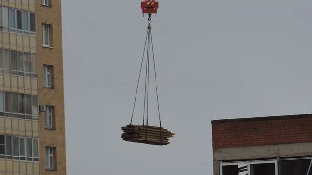 Загрузка Камаза башенным краном, под дождём - Стоит КамАз с угла дома, его грузит строительный кран.