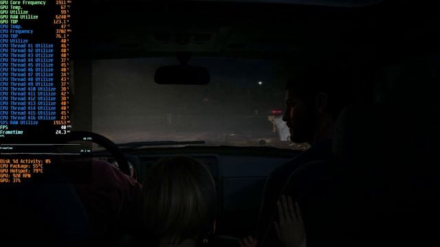 The Last of Us: Part I (Remake) v1.0.1.6 с мониторингом производительности; Разрешение 1920x1080, настройки качества графики средние, AMD FSR Off. Конфигурация компьютера: Intel Xeon E5-2667 V2 (Stock 3.6~4.0 GHz, Turbo Boost Enable, HT Enable) ASUS P9X79 4x 8Gb DDR3 DR Samsung [1600MHz, 9-9-9-24] Palit GeForce GTX 1070 GameRock Creative X-Fi Fatal1ty PCI Sound Card SSD Kingston SHFS37A120G (ОС) HDD Western Digital WD10SPZX (игра) Windows 10 Pro x64 build 19044.2604 NVIDIA Display Driver v531.41 WHQL