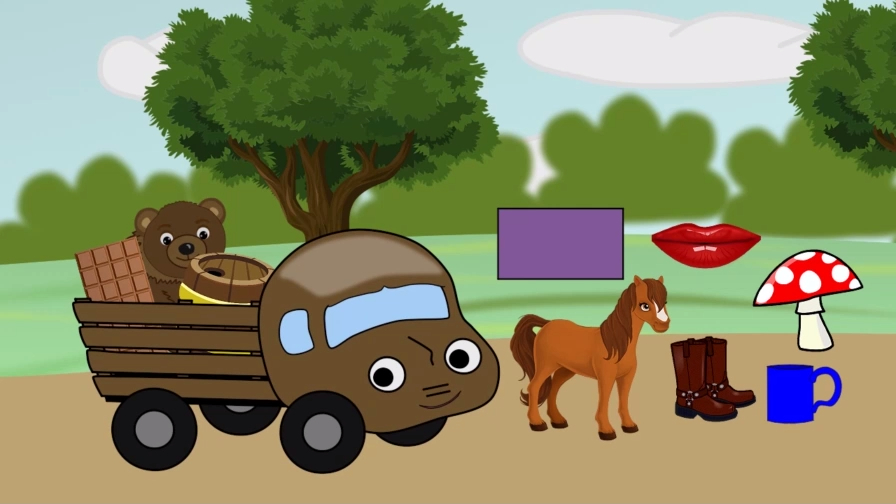 Сегодня мы выучим коричневый цвет. Едет коричневый грузовичок и встречает предметы разного цвета, дети вместе с грузовичком выбирают предметы только коричневого цвета.