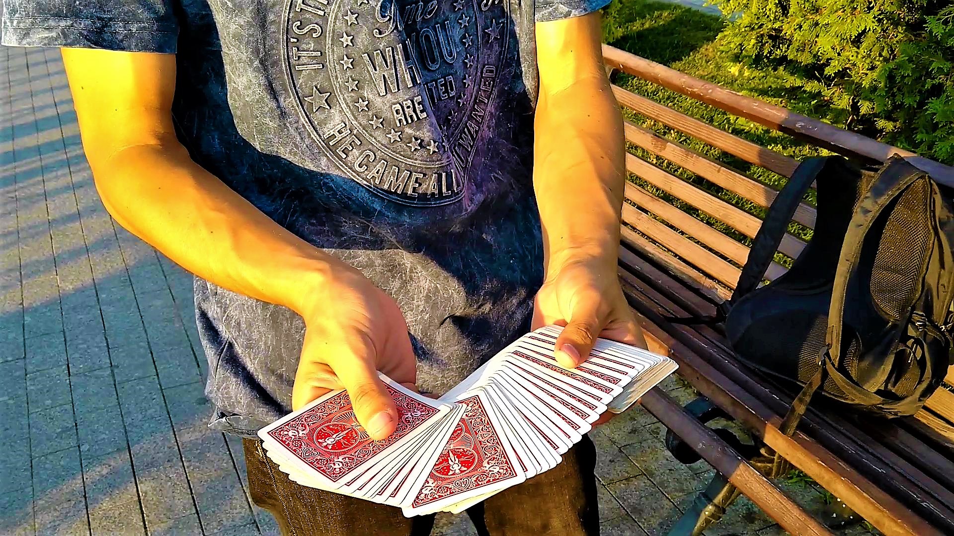 Фокус на картах на улице в Астрахани