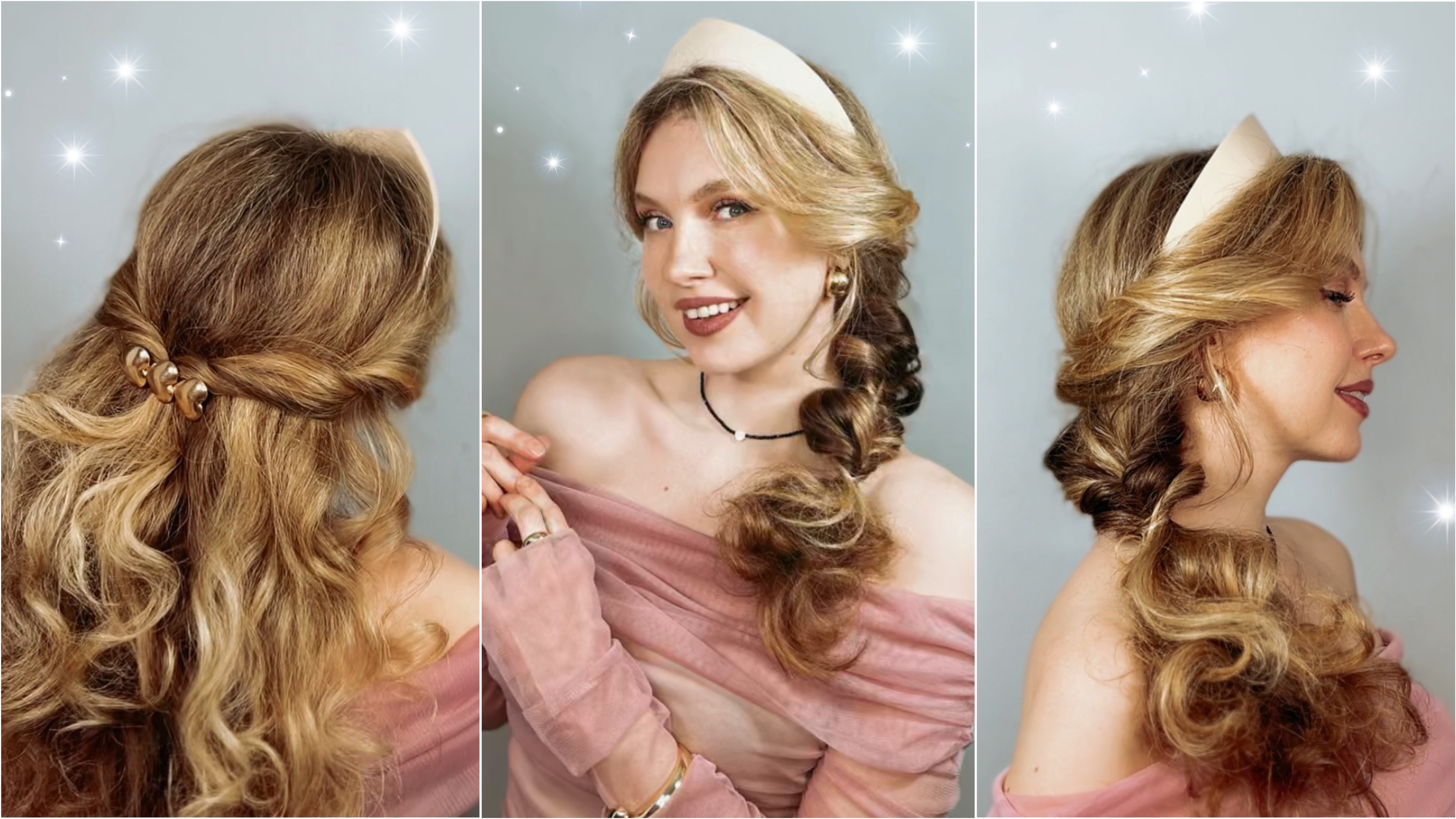 С такими причёсками можно почувствовать себя настоящей принцессой! Первый вариант - полураспущенная прическа. Очень романтичная и женственная. Далее продолжаем создавать красоту и трансформируем первую прическу в хвостик сбоку. Эта прическа так же очень интересно смотрится. Отличный вариант, когда не знаешь, какую прическу сделать с ободком, а распущенные волосы уже надоели. И последний вариант - та самая сказочная коса русской народной красавицы! Благодаря такой технике создания с помощью тонких силиконовых резинок, можно добиться роскошного объема в косичке! Желаю вам быть самыми красивыми, а главное - счастливыми! #сезонконтентаRUTUBE