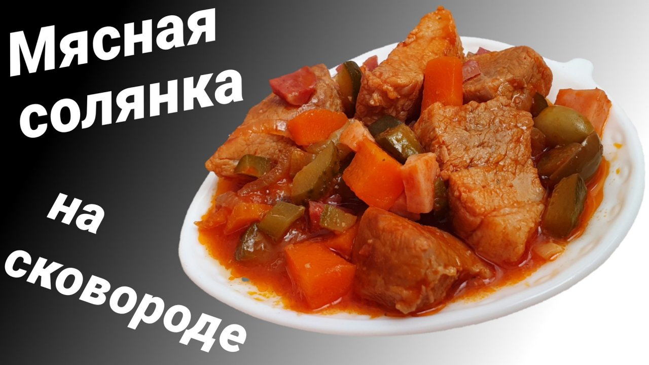 Солянка мясная с огурцами на сковороде