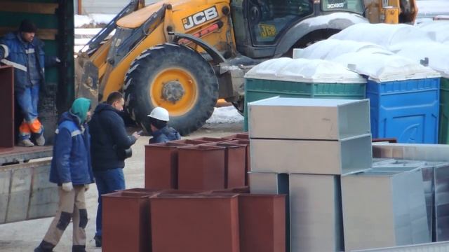Грузчики на стройплощадке разгружают фургон