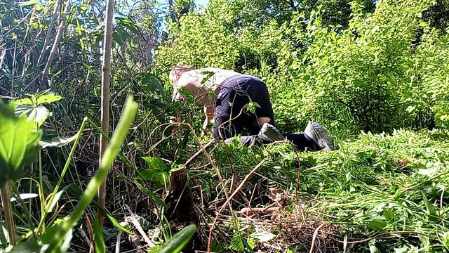 Рву траву у кустов чёрной смородины.