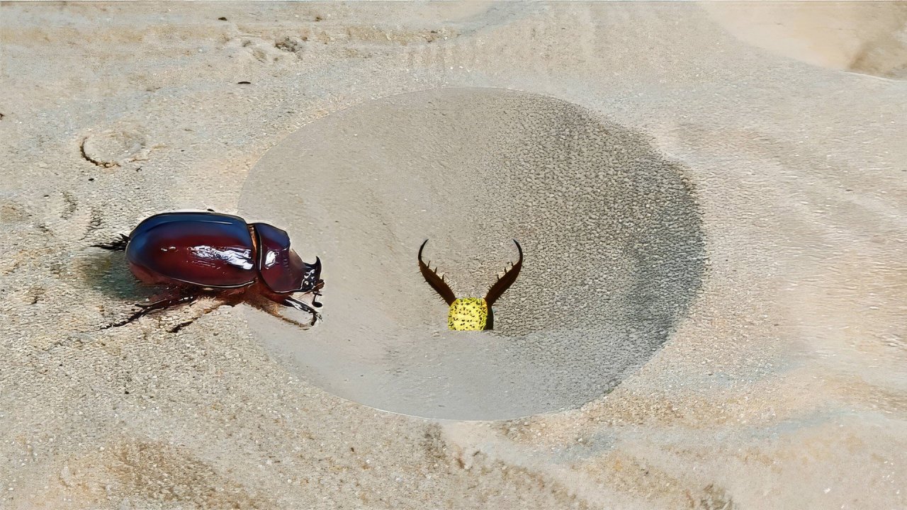 Что если Жук Носорог попадет в ловушку Муравьиного льва?