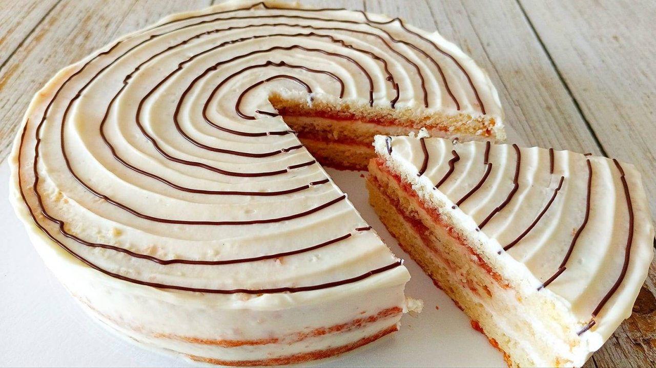Молочный МишкаДжем: Бисквит: 1. Яйца -2 шт.; 2. Сахар – 100 г.; 3. Кефир – 150 г.; 4. Мука – 120 г.; 5. Растительное масло – 60 г.; 6. Разрыхлитель – 10 г.; 7. Соль – ¼ ч.л.; 8. Ванилин – ¼ ч.л. Крем: 1. Творожный сыр – 300 г.; 2. Сливки жирные – 150 г.; 3. Сахарная пудра – 80 г.; 4. Ванильный экстракт. Начинка: 1. Джем (варенье пробитое) – 2 ст. ложки. Декор: 1. Шоколад. Общий выход готового изделия 1 кг. Пищевая ценность продукта на 100 грамм: Белки – 5 г.; Жиры – 17 г.; Углеводы – 29 г.; Энергия – 283 ккал. Мой Телеграмм канал: https://t.me/sladkiimaster _ Поддержи канал: Юмани кошелёк: 4100 1546 2997 635 PayPal: dusiagrusha@gmail.com __ Мои кондитерские фото и видео на телефон бесплатно: https://www.pexels.com/ru-ru/@133115461 __ Рекомендую мой блог на Яндекс Дзен. Где я публикую свои работы с оформлением Тортов и десертов: https://zen.yandex.ru/sladkii_master Особенности. *Яйца весом по 65-70 г.; *Кефир не менее 2.5% жирности; *Творожный сыр не менее 60% жирности; *В данном рецепте ProfeeCheese (Россия); *Сливки не менее 33% жирности; *Сливки охлаждённые; *Как правильно взбить сливки: https://dzen.ru/a/Z3FuKITS8G3h5nh6 *Вместо джема я пробил варенье в блендере; *Шоколад любой; *Время выпекания может отличаться от заявленного в рецепте; *Время выпекания зависит от диаметра формы, особенностей продуктов и функциональности духовки; *Рекомендуемый диаметр для выпекания 18-20 см.; *Разрезать холодные коржи; *Сборка с холодным кремом; *Хранить крем в холодильнике не более 3х суток.