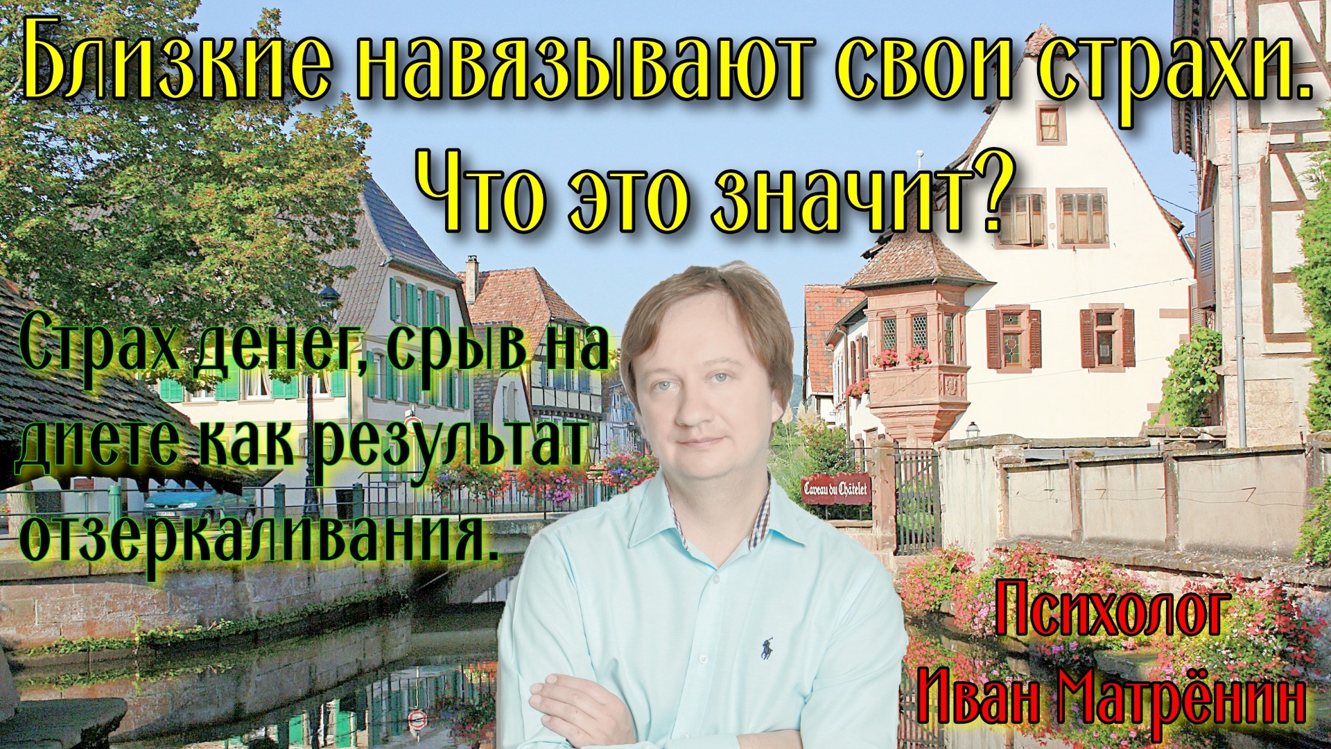 В этом фрагменте видео показан небольшой кусок передачи на радио, где мы обсуждали в эфире тему денег и того, почему людям их не хватает. Мы обсуждали и страхи, связанные с деньгами. В частности, ситуацию, когда родные и близкие навязывают свой страх человеку, на примере мужчины, написавшего на радио. Я же рассказал о том, что эти действия родных и близких может быть реакцией на твой собственный страх. Люди зеркалят близкого. Их страхи могут быть проекцией. Здесь, в видео я рассказываю и о том, как ещё проявляется это самое отзеркаливание. Обычная, для многих людей, сидящих на диете, ситуация. Муж, например, зная о том, что жена снижает вес, идя с ней по магазину покупает сладости, жирности, но точно не низкокалорийности. Почему? Он видит, что его жена с тоской смотрит на эти продукты и сочувствуя ей, берёт ситуацию в свои руки давая жене возможность сорваться. Подробнее, в этом видео. Приятного просмотра! Также можете смотреть это и другие видео у меня в аккаунте Instagram - https://www.instagram.com/sem.psiholog/ в IGTV! Там много текстов и видео на эту и другие темы по психологии и отношениям. Контакты: эл. почта – myvan@mail.ru. Телефон, WhatsApp, viber, telegram - +7 965 605 46 99 Соц. сети: Сообщество Facebook: группа - Иван Матрёнин Психология отношений – https://www.facebook.com/ivanmatreninpsi адрес в одноклассниках личный - https://ok.ru/myvan адрес вконтакте личный – Иван Матрёнин – https://vk.com/matreninivan Получить консультацию online на b17 - https://www.b17.ru/matrenin/ Мои сообщества Вконтакте: группа – «Психология семьи и отношений. Иван Матрёнин» – https://vk.com/ivan_matrenin группа – «Психология на русском языке и для наших людей» - https://vk.com/psiholog_matrenin группа – «Стройность от психолога. Блог Ивана Матрёнина» – https://vk.com/stroinost_matrenin группа – «Про гипноз и НЛП» - https://vk.com/gipnoz_matrenin Вступайте, пишите! Видео можно посмотреть на моём канале в YouTube - http://www.youtube.com/c/ПсихологИванМатрёнин. Ссылка на это видео в YouTube - https://youtu.be/KIPjF0lSo2E