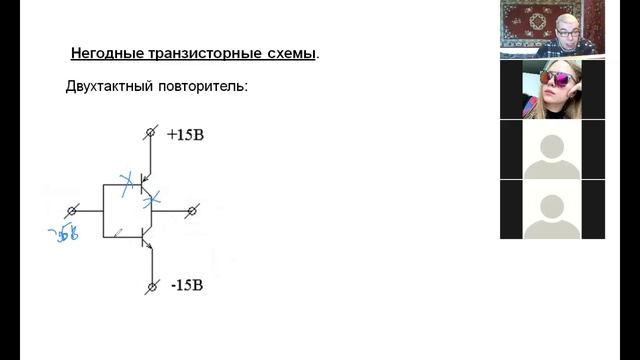 4 лекция, часть 3, Искусство схемотехники, СПбГУ, 2021, Крылов И. Р., негодные транзисторные схемы: двухтактный повторитель.