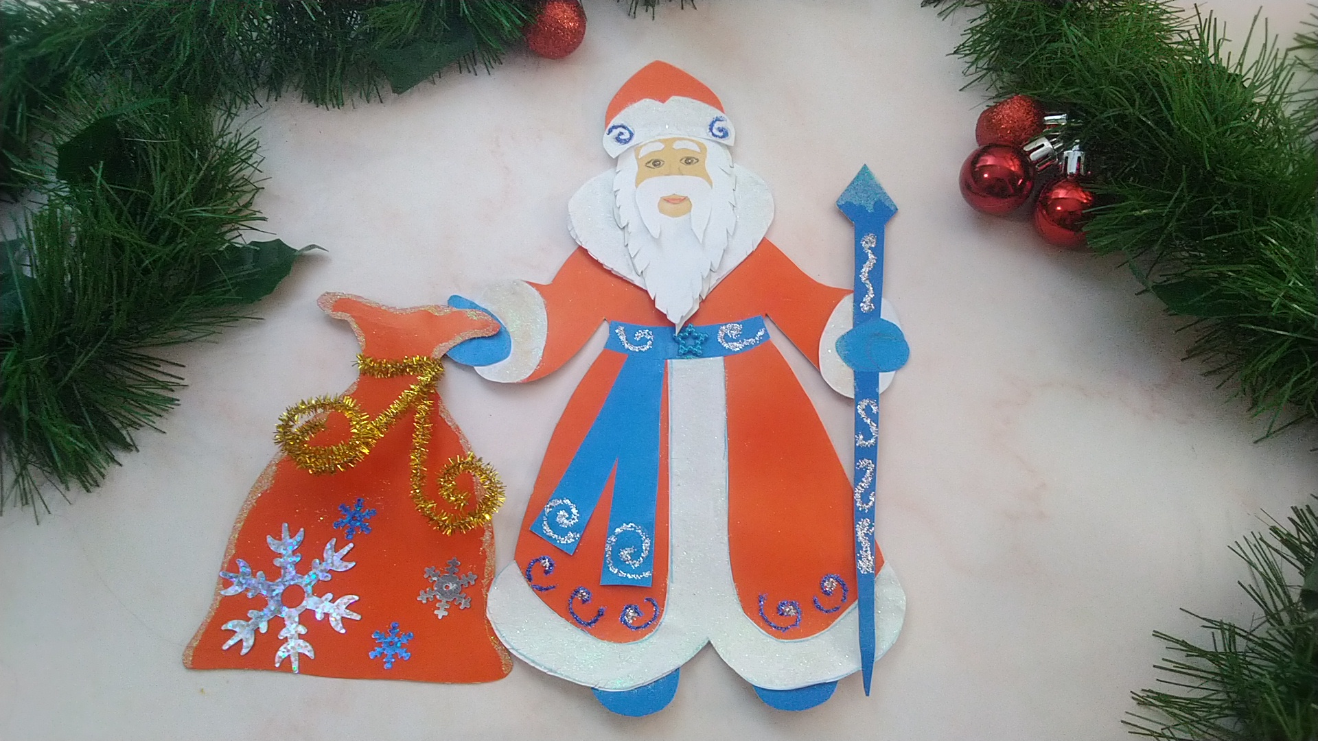 ДЕД МОРОЗ с мешком подарок. Новогодняя аппликация из цветной бумаги и картона.
