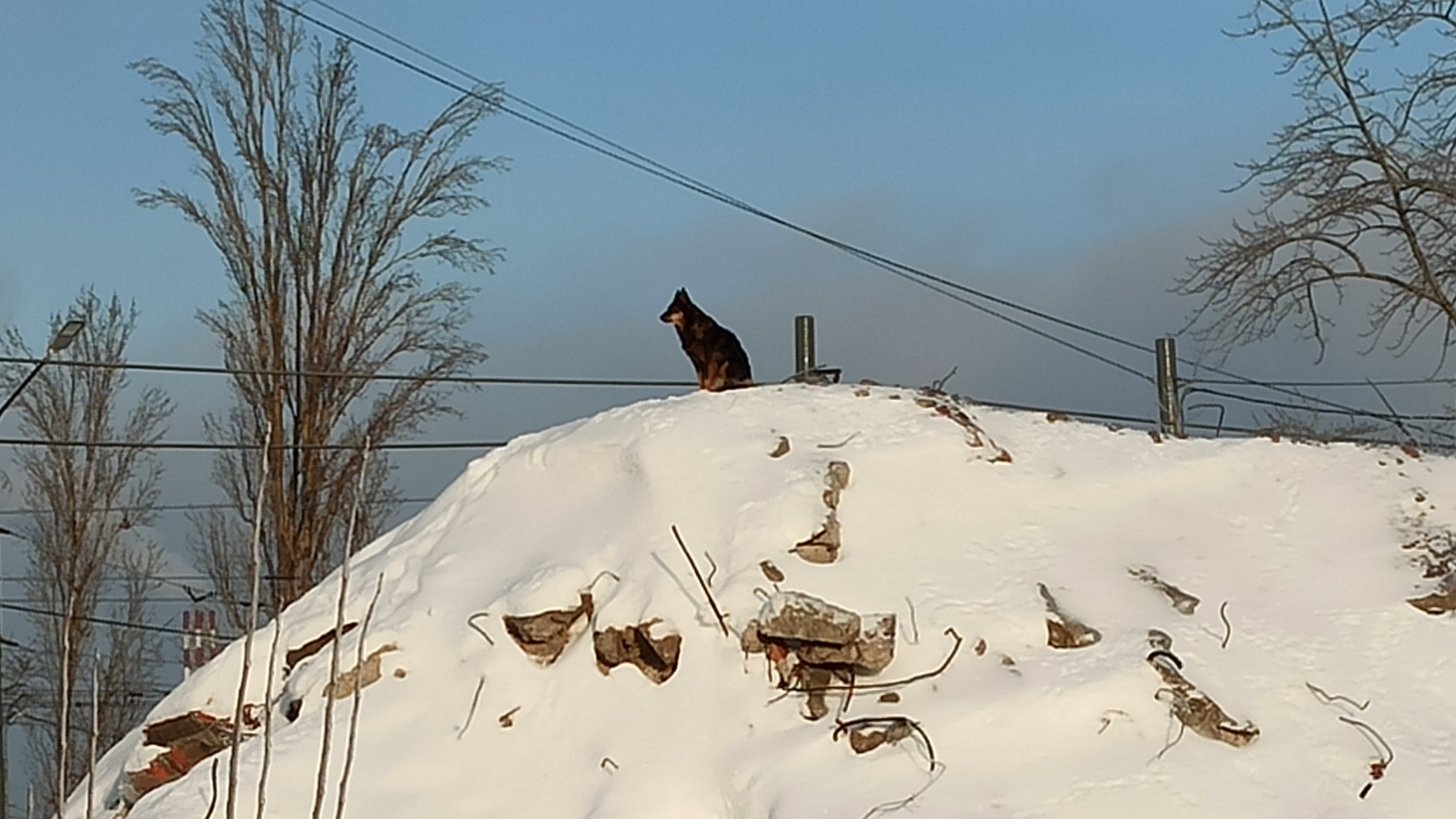 Шёл как-то недавно мимо заброшенной стройки, услышал лай собаки. Подумал, может нужна помощь, место то заброшенное. Зашёл на площадку долгостроя, благо ворота давно сорваны с петель, посмотрел откуда слышен лай - оказалось прямо с самого верха горы грунта посреди площадки. Гляжу, не больная и лает вроде не жалобно, но чётка в сторону многоэтажек. Через несколько минут смотрю идёт сюда женщина, несёт еду. А собака завидев её быстренько спустилась с горы за вкусной трапезой. Оказывается эта собака и ещё одна (а иногда 3, 4 и даже 5) давно тут обитают, вероятно ещё с времён подготовки к чемпионату мира по футболу, тогда на территории этого долгостроя был склад стройматериалов для строительства стадиона, - помогали сторожам охранять за еду. И вот эта собачка, как по часам залезает на горку и от туда зовёт лаем кормилиц из многоэтажек, которые их регулярно подкармливают. Через пару дней и я принёс обрезки мяса. Я посвистел и из-под старых плит вышла собака, которую я видел. Осторожная, пока я не отошёл от корма, не подходила. Сегодня снова по пути зашёл с вкусняшками и увидел вторую собаку (шерсть более короткая чем у первой собаки). Тропа на эту площадку снегом как-будто не заметаемая, постоянно протоптанная от ворот человечьими следами, а из долгостроя - собачьими. Вот такая история знакомства с четвероногими!