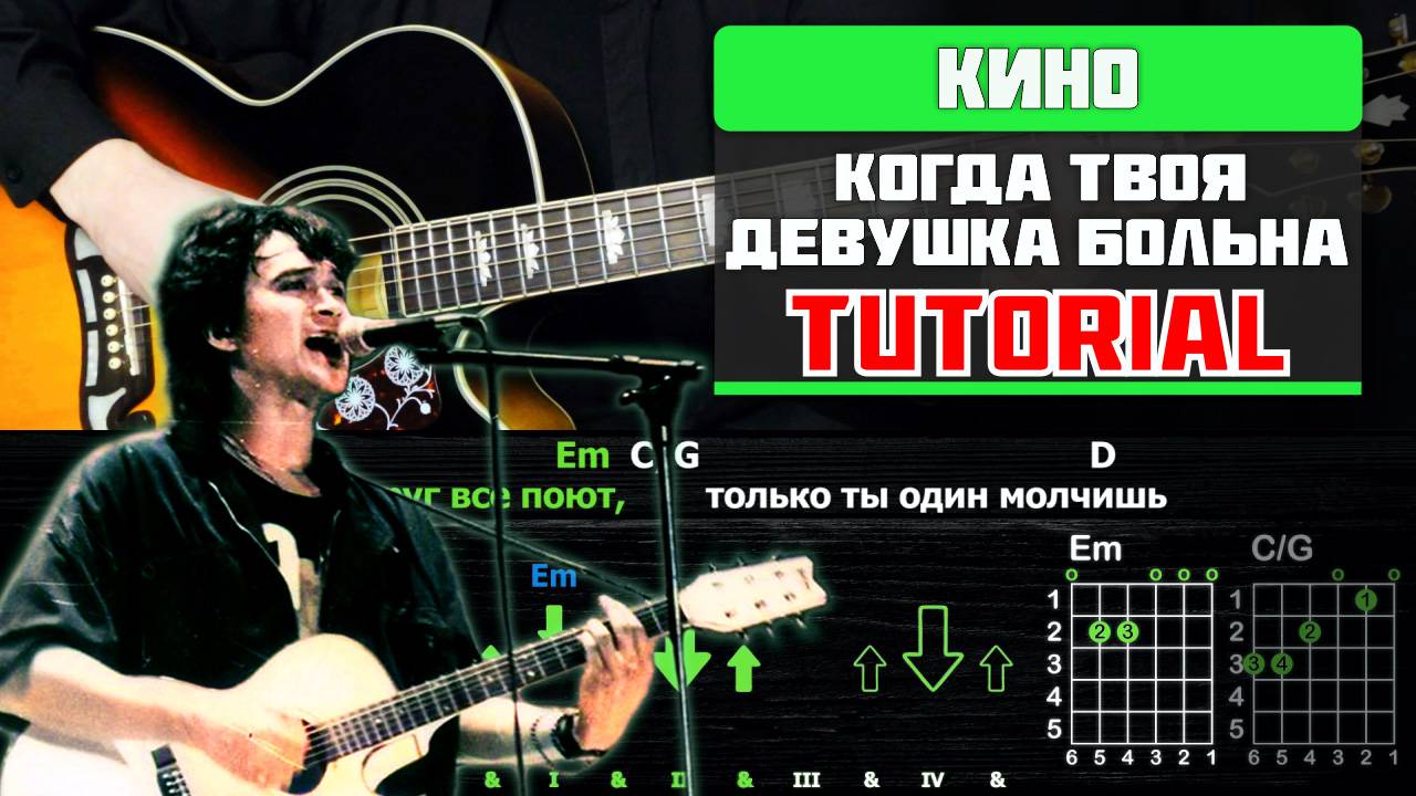 Как играть Кино - Когда Твоя Девушка Больна" на гитаре (Соло + Ритм)! Разбор (табы, аккорды и бой) ● Подробный разбор доступен: 1) На Бусти: https://boosty.to/guitarup/posts/017db781-4eb8-4f84-8c0e-d3afd290cced?share=success_publish_link 2) В тг: https://t.me/tribute/app?startapp=s4tO ● Табы (GuitarPro): https://boosty.to/guitarup/posts/e2204e96-c079-4adb-b7aa-78a0570a1a2b?share=post_link ● Табы + MP3 + Видеотабы: https://boosty.to/guitarup/posts/2b4907f2-4cde-4d98-9012-79c82b53d1d5?share=post_link ● ПОДДЕРЖАТЬ КАНАЛ: Boosty - https://boosty.to/guitarup - Попадание в титры - База подробных разборов - Закрытый ТГ-чат - Табы в PDF и GuitarPro формате - MP3 файлы (голос, гитара) - Видеотабы с оригинальным звуком - Прислать свою запись и получить комментарии - Заказать разбор песни ● Группа Вконтакте: https://vk.com/guitarupyoutube ● Телеграм-канал - https://t.me/guitarupytube ● ГИТАРА, СТРУНЫ и всё моё оборудование тут 👉https://t.me/guitarupytube/126 ● Тайминг: 0:00 - Руководство 0:03 - Аккорды и Текст 0:07 - Вступление 0:37 - Куплет №1 1:10 - Припев №1 1:39 - Куплет №2 2:15 - Припев №2 3:08 - Концовка Хочешь научиться играть один из самых проникновенных хитов Виктора Цоя? В этом видео ты получишь детальный разбор песни "Когда твоя девушка больна" – от простых аккордов до красивого соло! 🎯 Этот урок идеально подойдёт: ✅ Новичкам – если хочешь добавить в репертуар классику русского рока ✅ Опытным гитаристам – если ищешь точный разбор соло ✅ Всем поклонникам Цоя – чтобы играть с той же эмоцией, что и оригинал Если видео было полезным, поставь лайк и подпишись – впереди ещё больше разборов культовых песен. Напиши в комментариях, какую композицию из репертуара "Кино" разобрать следующей! #Кино #Цой #КогдаТвояДевушкаБольна #Гитара #РазборПесни #Табы #Соло #РусскийРок #ОбучениеГитаре ● Текст: [Вступление] G D G D | G D G D C/G C/G* | D Dsus2 D5 D7(no3) G6 D6add9/F# | Em D C/G C/G* | D5 D7(no3) D6sus2 D5 G6 D6add9/F# | Em D C/G C(b5)/G C/G | D5 D/F# D5 G D G D | G D G D [Куплет 1] G Em C/G D День как день, только ты почему-то грустишь G Em C/G D И вокруг все поют, только ты один молчишь G Em C/G D Потерял аппетит и не хочешь сходить в кино G Em C/G D Ты идёшь в магазин, чтобы купить вино [Припев] C/G D G D6/F# Em D Солнце светит, и растёт трава, но тебе она не нужна C/G D Всё не так и всё не то G D6/F# Em D C/G D Когда твоя девушка больна... М-м-м-м... G D6/F# Em D C/G D Когда твоя девушка больна... М-м-м-м... G Когда больна... [Проигрыш] G D G D | G D G D [Куплет 2] G Em C/G D Ты идёшь в магазин, головою поник G Em C/G D Как будто иссяк чистый горный родник G Em C/G D Она где-то лежит, eст мёд и пьёт аспирин G Em C/G D И вот ты идёшь на вечеринку один [Припев] C/G D G D6/F# Em D Солнце светит, и растёт трава, но тебе она не нужна C/G D Всё не так и всё не то G D6/F# Em D C/G D Когда твоя девушка больна – на вечеринку один G D6/F# Em D C/G D Когда твоя девушка больна – на вечеринку один G D6/F# Em D C/G D Когда твоя девушка больна... М-м-м-м... G D6/F# Em D C/G D Когда твоя девушка больна... М-м-м-м... G D6/F# Em D C/G D Когда твоя девушка больна [Концовка] G D6/F# Em D C/G D G D G D | G D G D C/G C/G* | D Dsus2 D5 D7(no3) G6 D6add9/F# | Em D C/G C/G* | D5 D7(no3) D6sus2 D5 G6 D6add9/F# | Em D C/G C(b5)/G C/G | D5 D/F# D5 G D G D | G D G D G