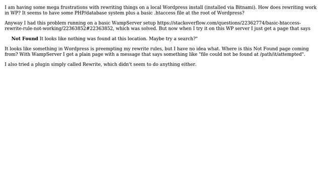 Wordpress: htaccess rewrite ignored Helpful? Please support me on Patreon: https://www.patreon.com/roelvandepaar With thanks & praise to God, and with thanks to the many people who have made this project possible! | Content (except music & images) licensed under CC BY-SA https://meta.stackexchange.com/help/licensing | Music: https://www.bensound.com/licensing | Images: https://stocksnap.io/license & others | With thanks to user Rarst (wordpress.stackexchange.com/users/847), user Moss (wordpress.stackexchange.com/users/37239), user Mark Kaplun (wordpress.stackexchange.com/users/23970), and the Stack Exchange Network (wordpress.stackexchange.com/questions/137778). Trademarks are property of their respective owners. Disclaimer: All information is provided "AS IS" without warranty of any kind. You are responsible for your own actions. Please contact me if anything is amiss at Roel D.OT VandePaar A.T gmail.com