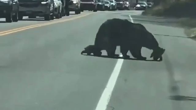 Мама-медведица и её непослушные карапузы устроили пробку на дороге 🐻