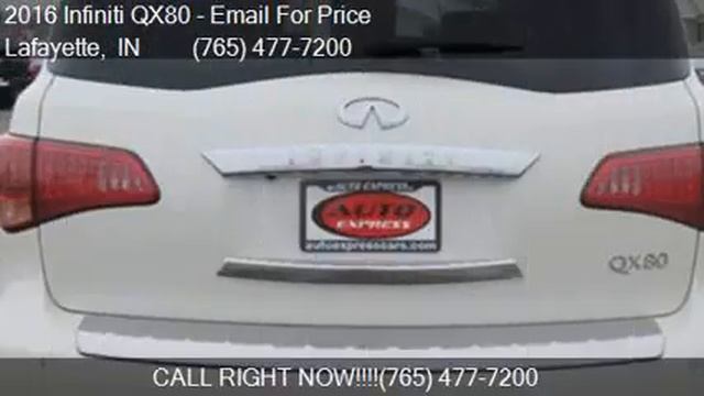 This 2016 Infiniti QX80 4x4 20" Premium Alloys Navigation Heated/Cooled Le is for sale in Lafayette, IN 47909 at Auto Express. Contact Auto Express at http://www.bestusedcardealsindiana.com or http://www.carsforsale.com/vehicle/details/3-16964052 Engine: 5.6L V8 Transmission: Automatic 7-Speed Color: Majestic White Mileage: 13691 Contact Auto Express 2306 Veterans Memorial Pkwy S Lafayette, IN 47909 to test drive this 2016 Infiniti QX80 4x4 20" Premium Alloys Navigation Heated/Cooled Le today.