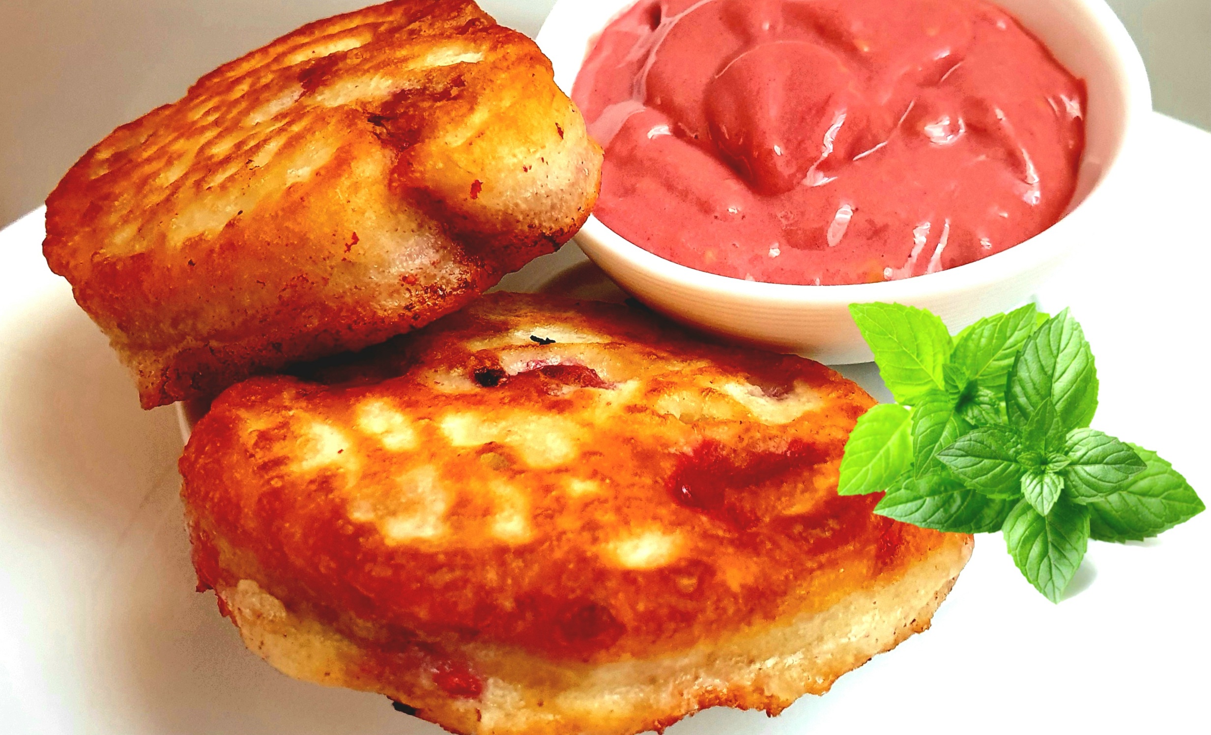 Пышные оладьи на кефире с малиной и малиновым кремом.