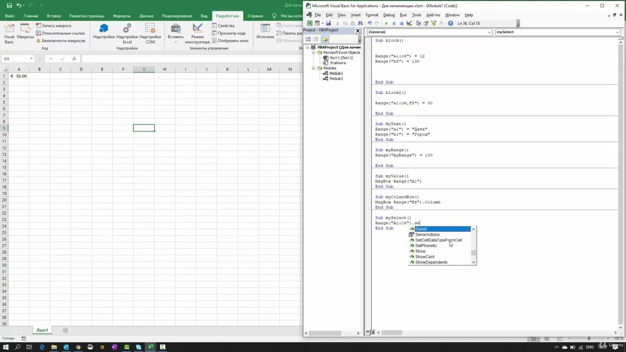 Свойство Range Select. Свойства диапазона. Программирование макросов в Excel.