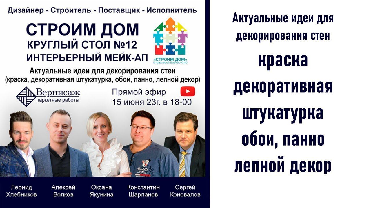 Актуальные идеи для декорирования стен: краска, декоративная штукатурка, обои, панно, лепной декор СПИКЕРЫ: Леонид Хлебников – руководитель компании ВЕРНИСАЖ ПАРКЕТ Москва (vk.com/khlebnikovleonid) Алексей Волков – Директор по развитию компании "DECARO" (vk.com/decaropro) Оксана Якунина – дизайнер интерьеров (vk.com/id124686124) Константин Шарпанов – руководитель строительной компании (vk.com/etalonhome) Сергей Коновалов – руководитель отдела по работе с архитекторами и дизайнерами компании ВЕРНИСАЖ ПАРКЕТ Москва (https://vk.com/konovalovcom) ДАТА: 15 июня 2023г . ВРЕМЯ: в 18:00