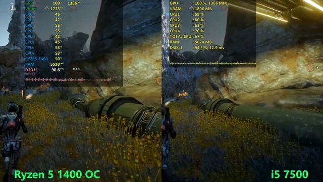 Ryzen 5 1400 OC vs i5 7500 - Gaming benchmarks (side by side comparison) , video editing, encoding tests. Will the low priced r5 1400 offer better performance than i5 after overclocking ? Let's find out in this video ! Games tested in this benchmark (s) video: Battlefield 1 - 00:01 Resident Evil 7 - 0:55 Project cars - 1:23 Rise of the tomb raider - 1:44 Mass effect andromeda - 2:12 Crysis 3 - 2:32 The Witcher 3 - 2:55 Farcry primal - 3:16 GTA 5 - 3:36 dirt rally - 4:13 productivity tests cinebench r15 - 4:27 7 zip compression (zip) - 4:31 handbrake video conversion - 4:37 adobe premiere cc (video editing) - 4:41 Test system details AMD ryzan 5 1400oc - stock cooler and 3.75 overclocked frequency motherboard [amd] msi b350m pro vdh Radeon RX 580 4 GB - MSI armor oc RAM Corsair Vengenace LED 3000 (3066) MHz SSD samsung 850 evo , sandisk x400 HDD WD black 7200 rpm Intel core i5 7500 [intel] msi b250m mortar motherboard corsair vengeance 2400 mhz RAM 650 watts psu corsair tx vmreviews vmreview80@gmail.com