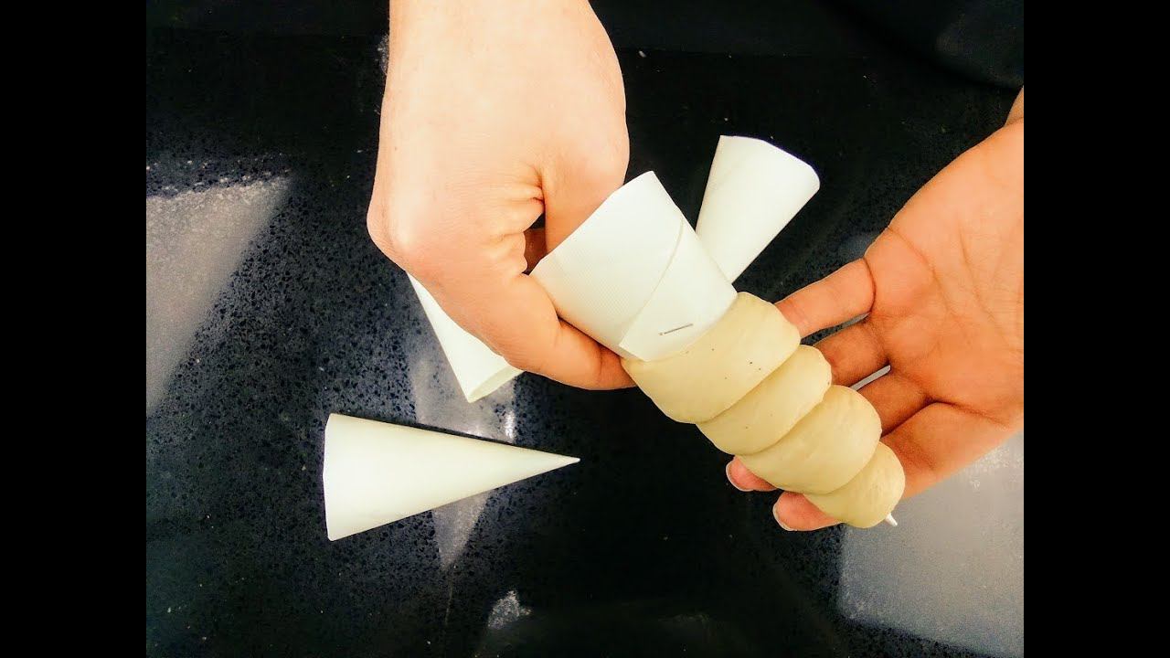 Накручиваем тесто на бумажные формы и готовим булочки-трубочки с кремом