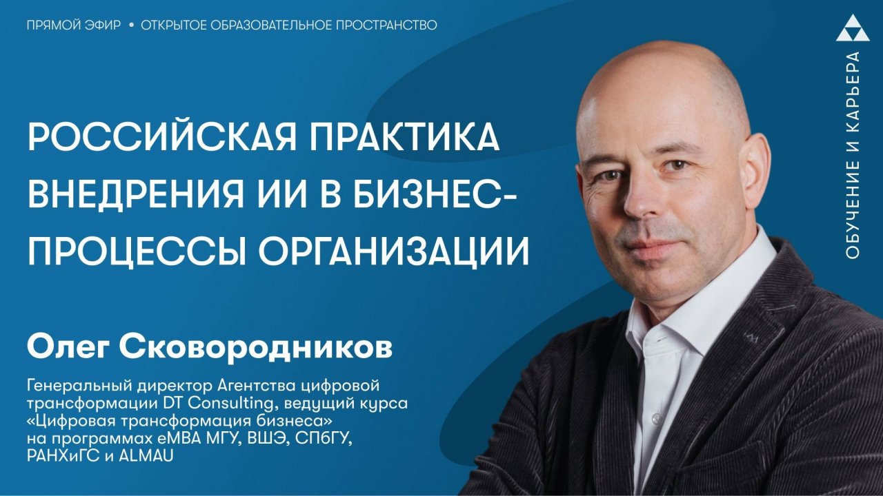 Сегодня ИИ — самая перспективная и быстроразвивающаяся цифровая технология, проникающая во все сферы жизни людей. Руководители это понимают и ищут варианты, как эффективно применить новые технологии конкретно для их организации. Какая практика складывается в российских компаниях и почему без использования ИИ-технологий невозможно достичь качественных результатов и быть конкурентоспособным? Об этом и не только поговорим на вебинаре. Олег Сковородников, генеральный директор Агентства цифровой трансформации DT Consulting, ведущий курса «Цифровая трансформация бизнеса» на программах eMBA МГУ, ВШЭ, СПбГУ, РАНХиГС и ALMAU Сергей Журихин Проректор по повышению квалификации Университета Правительства Москвы #мгуу #рутуб #rutube #ИИ #нейросети #Open.AI #AI #ОлегСковородников #СергейЖурихин #УниверситетПравительстваМосквы #ООП #открытоеобразовательноепространство