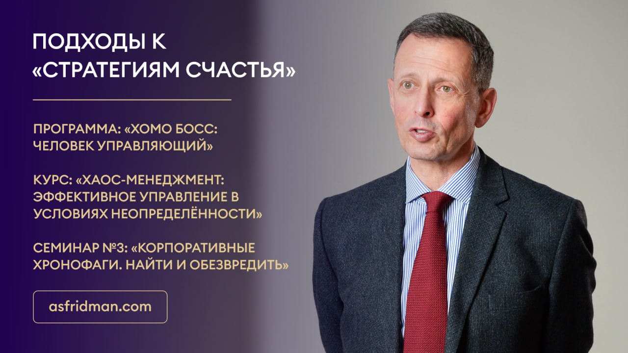 Подходы к «стратегиям счастья» Программа: «Хомо Босс: Человек Управляющий» Курс: «Хаос-Менеджмент: Эффективное управление в условиях неопределённости» Семинар №3: «Корпоративные хронофаги. Найти и обезвредить» Расписание открытых семинаров Александра Фридмана: https://www.asfridman.com/raspisanie/