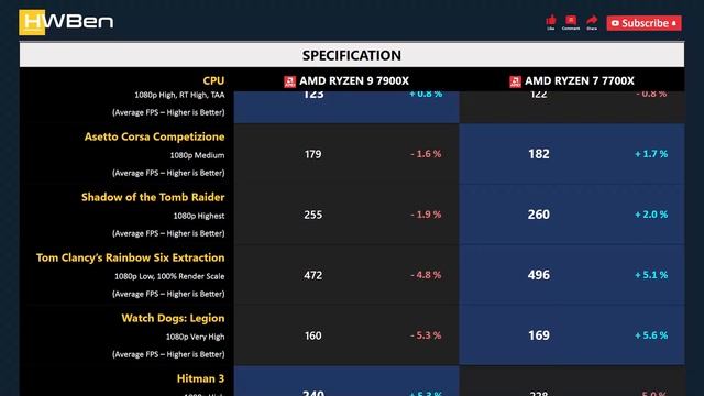AMD Ryzen 9 7900X vs AMD Ryzen 7 7700X - 13 Games & Apps (RTX 4090) APPS BENCHMARK 1 - Cinebench 2 - Blender 3 - Adobe Photoshop GAMING BENCHMARK 1 - Factorio 2 - Hogwarts Legacy 3 - Spiderman Remastered 4 - Asetto Corsa Competizione 5 - Shadow of the Tomb Raider 6 - Tom Clancy’s Rainbow Six Extraction 7 - Watch Dogs: Legion 8 - Hitman 3 9 - Horizon Zero Dawn 10 - Cyberpunk 2077 11 - The Riftbreaker 12 - CS: GO 13 - A Plague Tale: Requiem 14 - Power Consumption Source: https://hwben.com/amd-ryzen-9-7900x-vs-amd-ryzen-7-7700x-13-games-apps-rtx-4090/ Other benchmark: https://hwben.com BUY FROM AMAZON - AMD Ryzen 9 7900X : https://hwben.com/noindex/buy.php?q=AMD+Ryzen+9+7900X - AMD Ryzen 7 7700X : https://hwben.com/noindex/buy.php?q=AMD+Ryzen+7+7700X Partner: https://testi.xyz #RYZEN97900X #RYZEN77700X