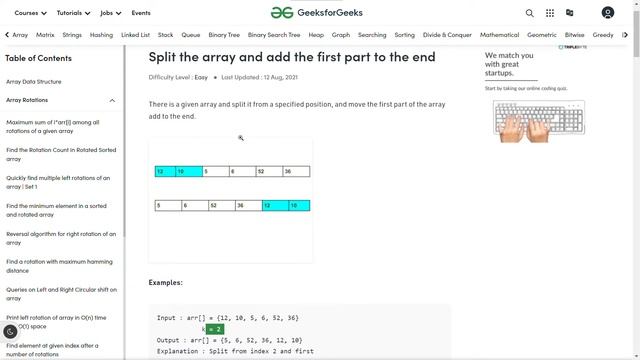 We are given an array and an integer (say k). We need to split the array from an index=k and finally shift the first part of split to the end. Problem Link: https://www.geeksforgeeks.org/split-array-add-first-part-end/ Related Video Links: 1. Some array rotation approaches - https://youtu.be/57NO1H8CuFE 2. Reversal algorithm for array rotation - https://youtu.be/3KM9Xjya81w 3. Block swap algorithm for array rotation -https://youtu.be/QQvevWKypiA #arrayrotation #gfg #codesplaining