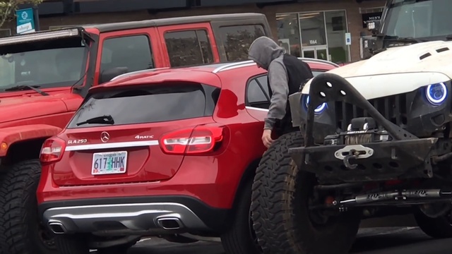 Два парня заметили на парковке магазина Мерседес, который стоит на двух парковочных местах и решили проучить водителя. Они заблокировали машину своими внедорожниками так, что когда пришел хозяин Мерседеса, то он не смог открыть двери и ему пришлось лезть через багажник. #авто #мерседес #парковка #проучил
