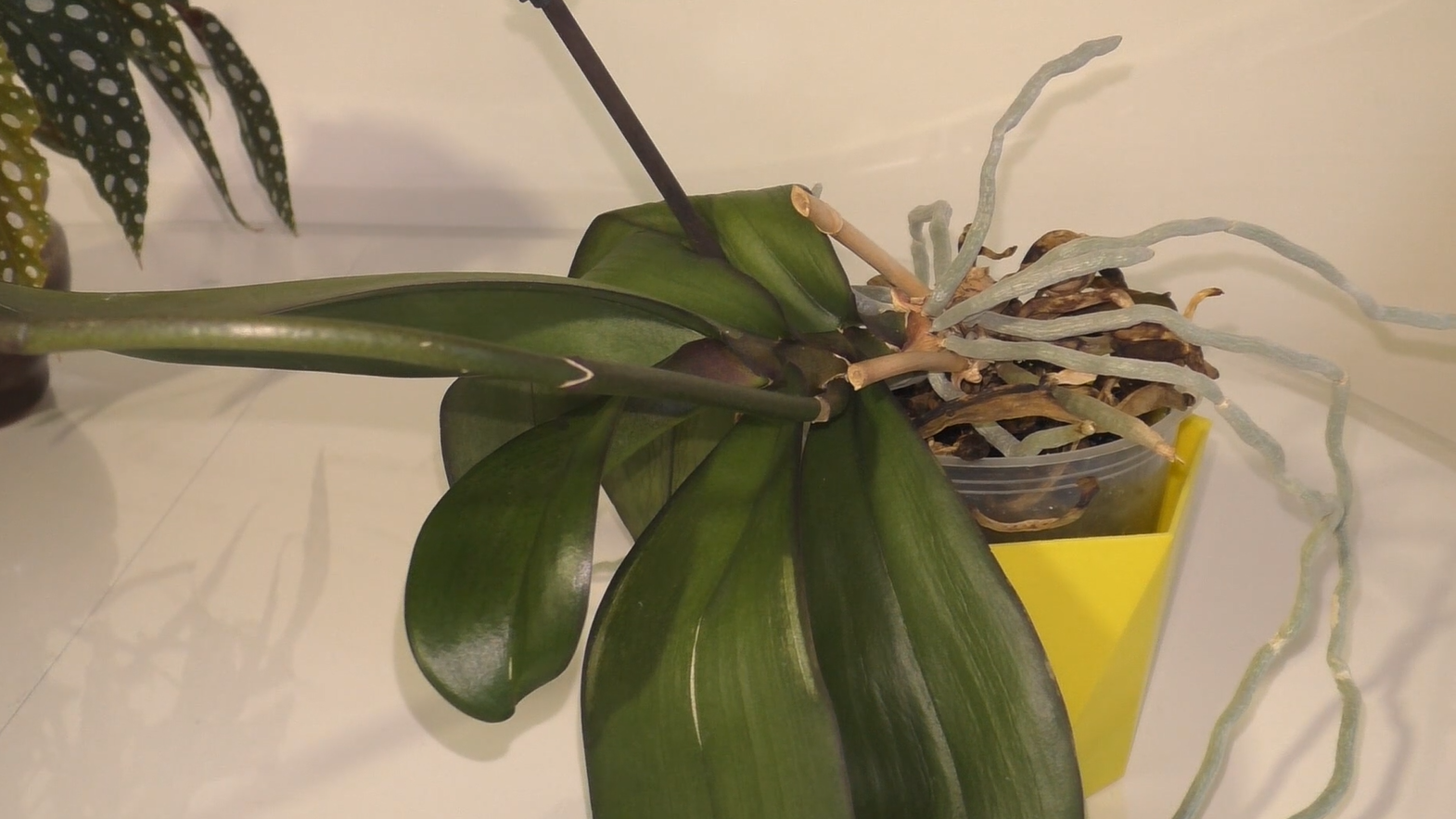 Орхидея сбросила последние корни и упала на бок. Теперь смело пересаживаю с цветоносом потому, что н