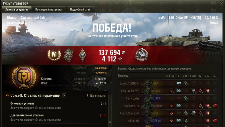 ШТИЛЬ МАСТЕР на Об. 156 0 ОПЫТ: 1713 СУММАРНЫЙ УРОН: 6857 медаль СТАРКА