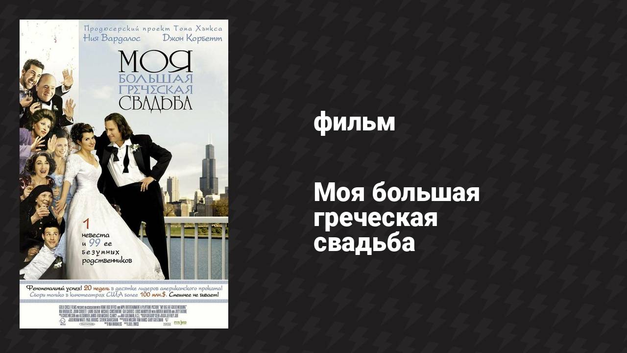 «Моя большая греческая свадьба» — это лёгкая и трогательная романтическая комедия, которая рассказывает о любви, культурных различиях и силе семейных уз. Фильм стал любимым для зрителей по всему миру благодаря своему искреннему юмору и неподдельной теплоте. Сюжет сосредоточен на Туле Портокалос, молодой женщине греческого происхождения, которая работает в семейном ресторане и мечтает о переменах в своей жизни. Влюбившись в Иэна Миллера, учителя с американскими корнями, Тула сталкивается с неприятием со стороны своей традиционной семьи, особенно её строгого отца, который уверен, что грек должен жениться только на гречанке. На фоне подготовки к свадьбе Тула и Иэн пытаются примирить свои культурные различия, сталкиваются с забавными ситуациями, вызванными эксцентричностью её родственников, и доказывают, что настоящая любовь способна преодолеть любые преграды. Год выпуска: 2001 Жанр: драма, мелодрама, комедия Продолжительность: 95 мин. Режиссёр: Джоэл Цвик В ролях: Ниа Вардалос, Джон Корбетт, Лэйни Казан, Андреа Мартин, Луис Мэндилор, Джерри Мендичино, Майкл Константин, Джиа Каридес, Джои Фатон, Иэн Гомес Cтрана: Канада, США Cтудия: Alliance Cinema, Ontario Film Development Corporation, Gold Circle Films, MPH Entertainment Productions, Playtone, Home Box Office (HBO) Здесь вы можете посмотреть фильм Моя большая греческая свадьба в русском синхронном переводе в хорошем качестве (4k, 2k, Full HD, 1080p) совершенно бесплатно.
