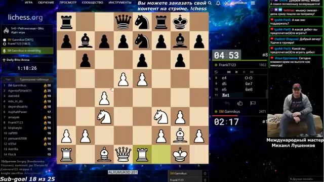 Multistreaming with https://restream.io/ Комментирует международный мастер Михаил Лушенков. Если хотите меня поддержать ставьте лайки! А так же подписывайтесь на мои каналы: https://www.youtube.com/channel/UCaefmNn_LQDEyyMq0nHBMgA https://goodgame.ru/channel/ganniklive/ https://www.twitch.tv/gannikchess DonationAlerts (Карты,QIWI,ЯДеньги,Сбербанк,Телефон,WebMoney) (озвучка ботом русского текста сообщений от 100 рублей) : http://www.donationalerts.ru/r/gannik2016 TwitchAlerts (PayPal, Карты, Yandex, QIWI, WebMoney и т.д.) (озвучка ботом от 100 RUB) : https://streamlabs.com/gannikchess Поддержка через плеер GoodGame.ru комиссия гудгейма 10 % (с левой стороны плеера). Минимальная сумма для озвучивания сообщения на стриме при донате через GoodGame.ru 100 рублей! Дискорд - https://discord.gg/cD92CWQ Группа вконтакте - https://vk.com/club51469705 для анонсов По вопросам обучения пишите на почту - lushenkov-chess@mail.ru Поддержка стримов Шахматы. Mikhail-Chess. Спасибо всем неравнодушным! Благодаря вашей поддержки нам удалось улучшить качество трансляций! Вы можете заказать свою тему на стриме! Просьба указывать детали заказа. Игрок Разыграть дебют (кроме одного варианта, он ниже) - 150 рублей. (здесь и далее за 1 партию) Разыграть дебют Эльшада любым цветом - 500 рублей Сыграть против стримера - 200 рублей Сыграть вслепую - 500 рублей Пожертвовать материал по ценности фигур (пешка=100, слон = 300 и т.д.) Выиграть(!) любым цветом любым дебютом - 500 рублей (игра до победы но не более 5 партий) Выиграть(!) с форой у донатера по ценности фигур умноженным на 2 (стример с донатером играют до победы стримера но не более 5 игр). Сыграть в шахматы на четверых 2000р за 1 игру Сыграть с форой по времени ( у стримера 1 минута у донатера до 10, например 1 против 6 = 500 рублей) Выиграть(!) с форой по времени ( у стримера 1 минута у донатера до 10 = в 2 раза дороже, например 1 против 6 = 1000 рублей) Играем до победы стримера но не более 5 партий. Сыграть в вашем турнире = 2000 рублей (1 час) Комментатор и организитор Разбор вашей (моей) партии - 150 рублей за игру(здесь и далее) Тщательно комментировать свою партию во время игры - 150 рублей Создать турнир - 1000 рублей (1 час) Создать сеанс - 150 рублей с человека Скипнуть (отменить) играемый вид шахмат и заказать свой (вне заказов зрителей) 2000 час. Выполнить ваш челлендж - цена договорная в зависимости от сложности. Передать привет или ответить на вопрос вне очереди - 100 рублей. Остальное выполняется по запросу. Готов обсудить другие ваши заказы контента на стрим. Желательно все перечисленное что бы выполнялось не во время важных турниров (призовых). Но если вы настаиваете то заказ будет выполнен. Если нет возможности выполнить в один стрим - все переносится на следующий, по просьбе заказчика. З.Ы. Премиум на Гудгейме(79 р месяц) приравнивается к 100 р. Sub на Twitche приравнивается к 300р.